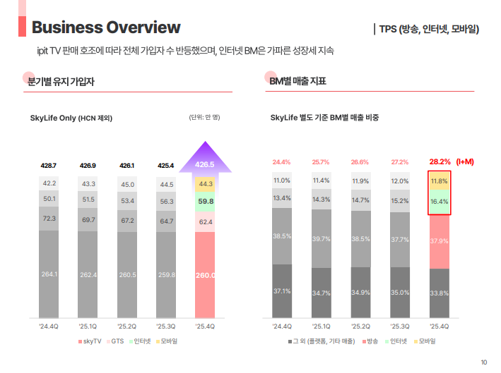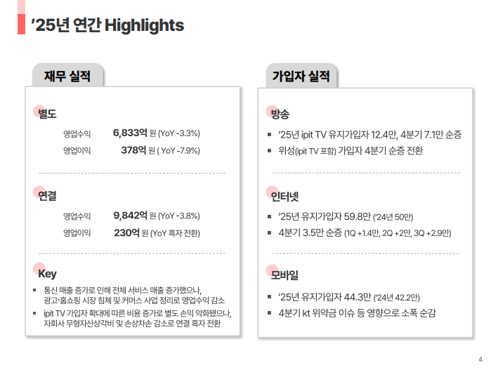 • IPTV 출시 관련 초기 투자 비용 집행에도 불구하고 2025년 연간 기준 전년도 수준 이상의 영업 성과 유지