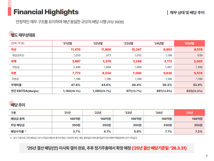 • 부채비율 50%대의 안정적인 재무 구조 유지와 함께 주당 350원 수준의 일관된 배당 정책 지속