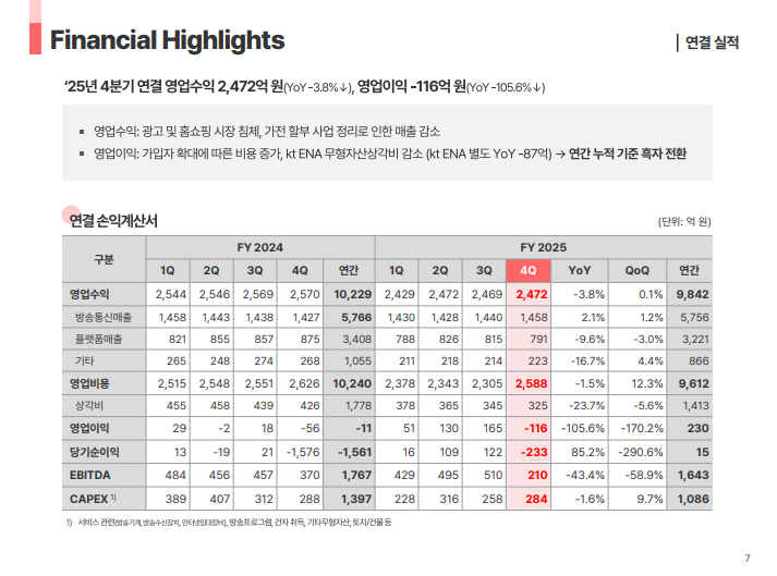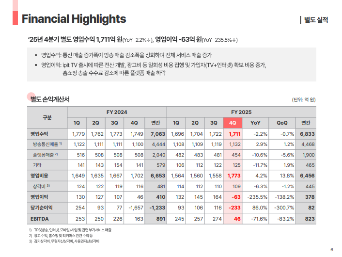 • IPTV 출시 관련 초기 투자 비용을 감안하더라도 2025년 연간 기준 전년도 수준 이상의 영업 성과 달성