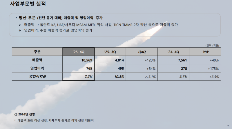 • 방산 부문은 수출 중심의 전략 제품을 대상으로 여러 건의 수주 파이프라인을 보유하고 있으며 2026년에도 수출 수주 확대 기대
