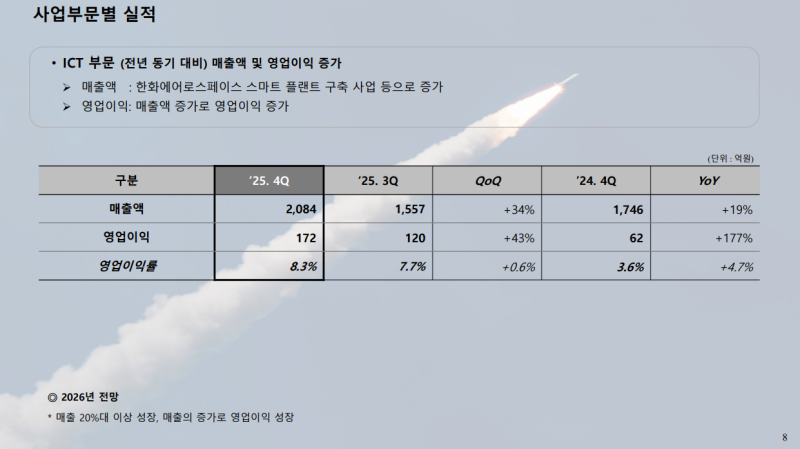 • 2025년 연간 매출은 방산 부문의 폴란드 K2, UAE 및 사우디 M-SAM, 다기능 레이더 등 수출 사업과 위성 사업, TICN TMMR 2차 양산 사업에서 발생한 매출과 ICT 부문의 계열사향 인프라 구축, 한화에어로스페이스 스마트 플랜트 통합 구축 사업 등을 통해 증가
