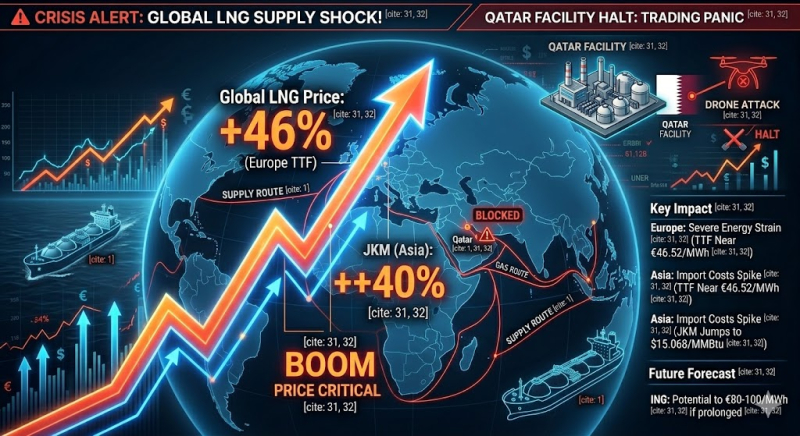 카타르 국영 에너지 기업 카타르에너지(QE)가 이란의 드론 공격으로 인해 라스라판 액화천연가스(LNG) 시설의 가동을 중단한다고 밝히면서, 유럽과 아시아 시장의 천연가스 가격이 일제히 폭등했다.