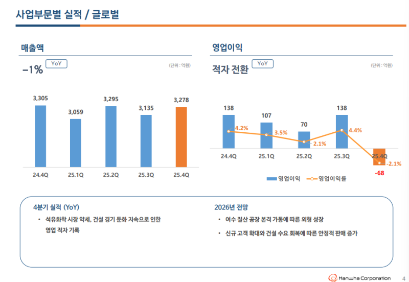 • 석유화학 시장 약세와 건설 경기 둔화 영향으로 글로벌 사업 부문 수익성 감소 반영
