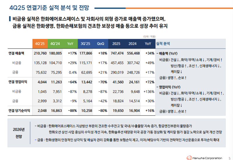 • 4Q25 연결 매출: 21조 760억 원 (QoQ +18%, YoY +17%), 비금융 부문 외형 성장 영향