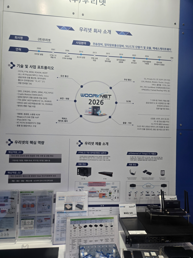 우리넷은 이달 22일부터 24일까지 서울 코엑스에서 열린 ‘월드 IT 쇼 2026’에 참가해 차세대 통신 장비 라인업과 기술 로드맵을 공개하며 시장의 이목을 집중시켰다.